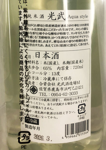 | 商品名 | 純米酒 光武 Aqua style アクアスタイル |