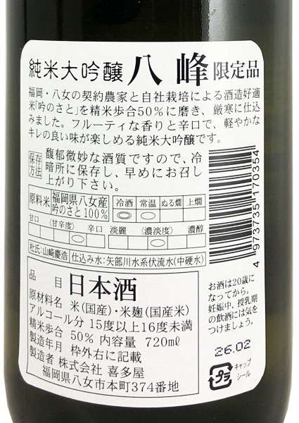| 商品名 | 喜多屋 純米大吟醸 八峰(やっほう)限定品 720ml 化粧箱付き |